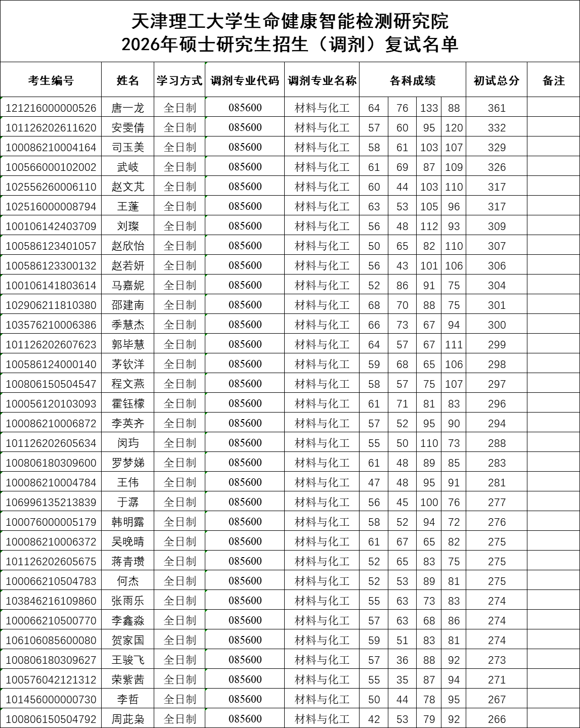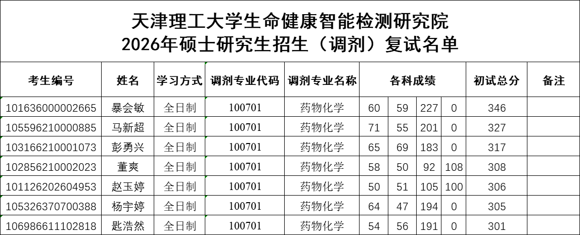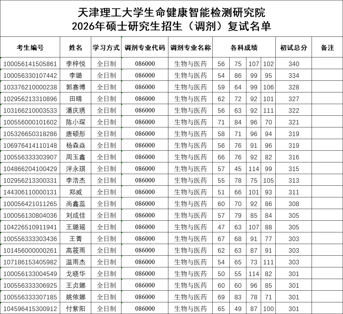 【2026年招生】---天津理工大学生命健康智能检测研究院2026年硕士研究生招生(调剂第1轮) 复试名单(材料与化工、生物与医药、药物化学)