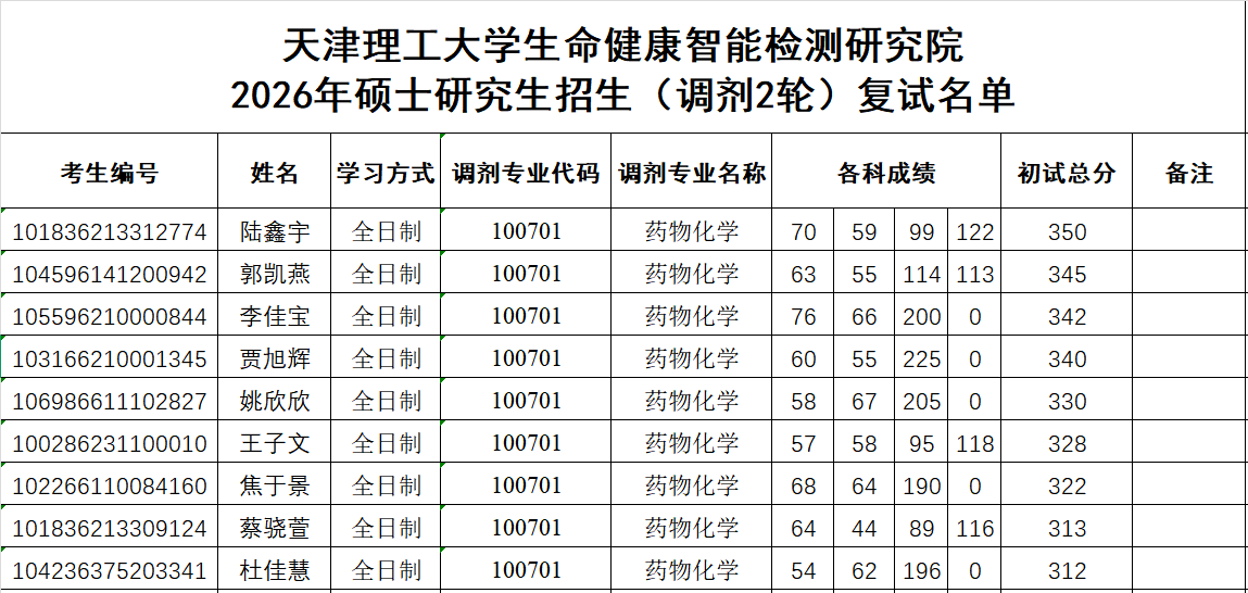 【2026年招生】---天津理工大学生命健康智能检测研究院2026年硕士研究生招生(调剂2轮)复试名单
