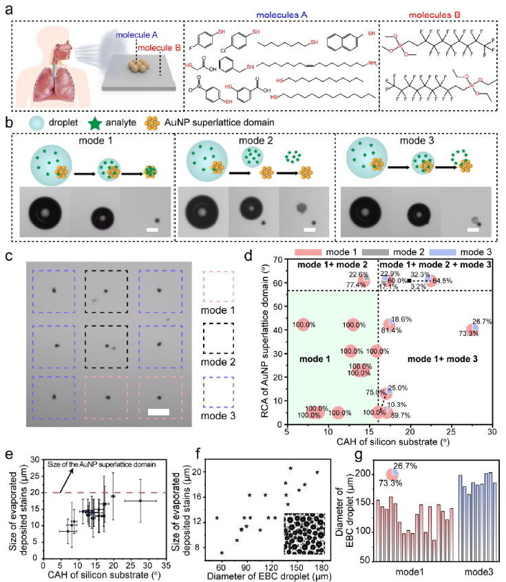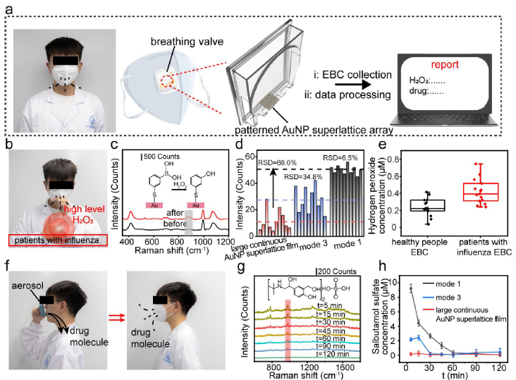 在系统建立液滴蒸发多模态行为的物理图景之后,研究团队进一步选取呼出气冷凝液(Exhaled Breath Condensate,EBC)作为研究体系,对所提出的蒸发调控策略进行验证。如图5所示,最终利用模式1实现了对于EBC中过氧化氢和药物的稳定监控。